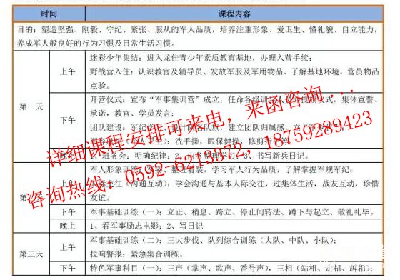 备注:十天课程计划中每天早上训练科目:军事基础训练或文明礼貌操,以及整理内务、内务评比;